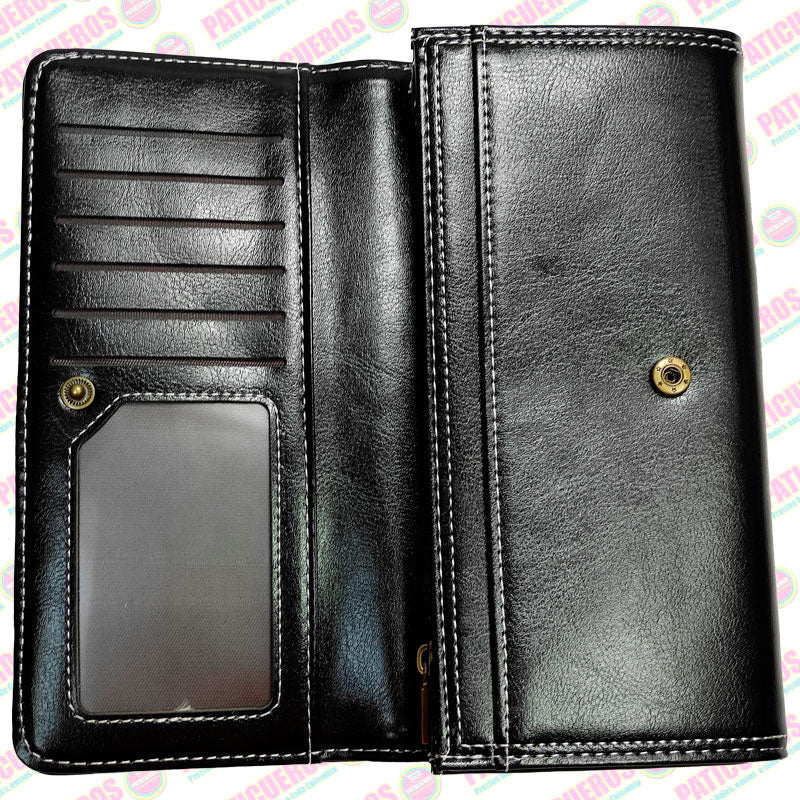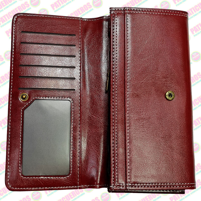En Paticueros siempre te traemos los mejores productos a precios cómodos. Te presentamos una espectacular billetera porta celular mujer importada. Están construidas por un material llamado cuero PU, que tiene propiedades parecidas al cuero genuino. Esta sujetada por medio de un broche principal. Al abrir la billetera, encontraremos dos compartimientos principales.